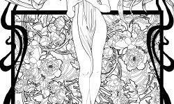 This was the first image I drew for the coloring book, though it wasn’t placed first in the book. The background is wild roses, hence the name. I don’t remember what species the foreground flower is. I reworked the face multiple times before publishing.